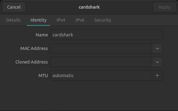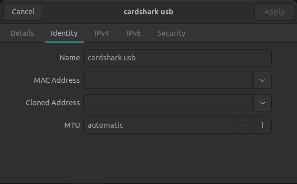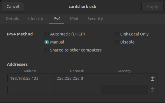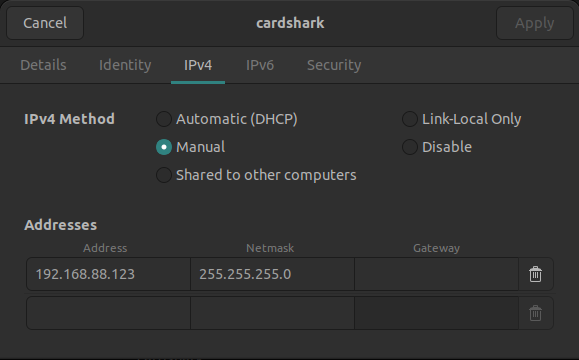 To create a networking connection to a Cardshark device from a Linux host machine, the host machines networking configuration must be compatible with the default IP address of the Cardshark.